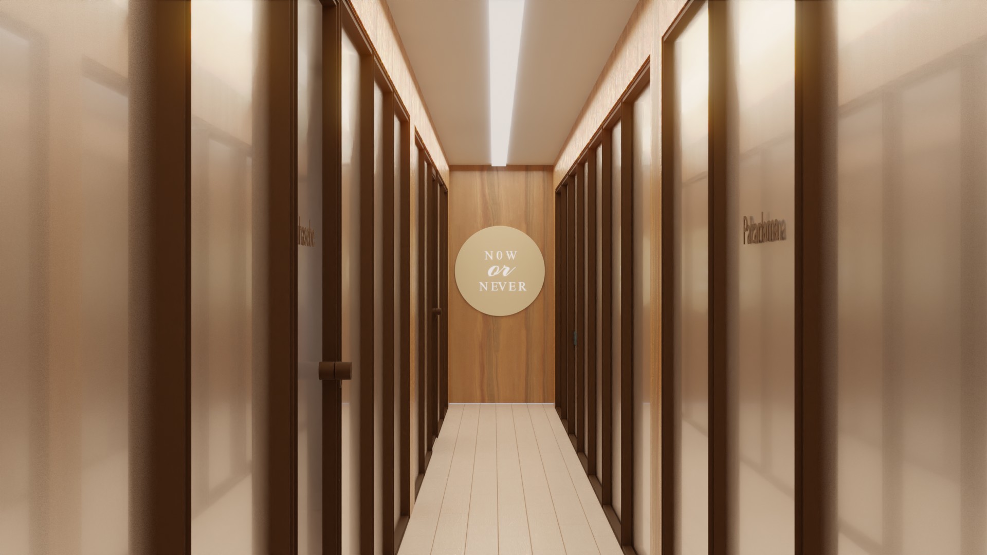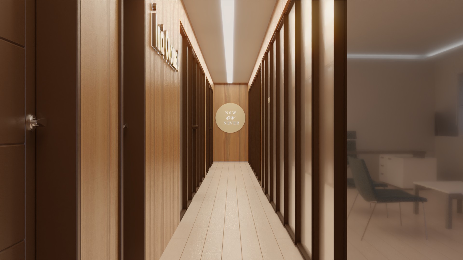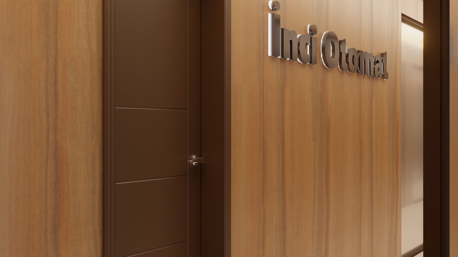 Bölmeler yapılıp hole bakan duvar kısımlarında meşe görünümlü mdflam uygulaması yapıldı. Hole bakan kısımlar alüminyum doğrama ile bölünüp kapı kısımları belirlendi.