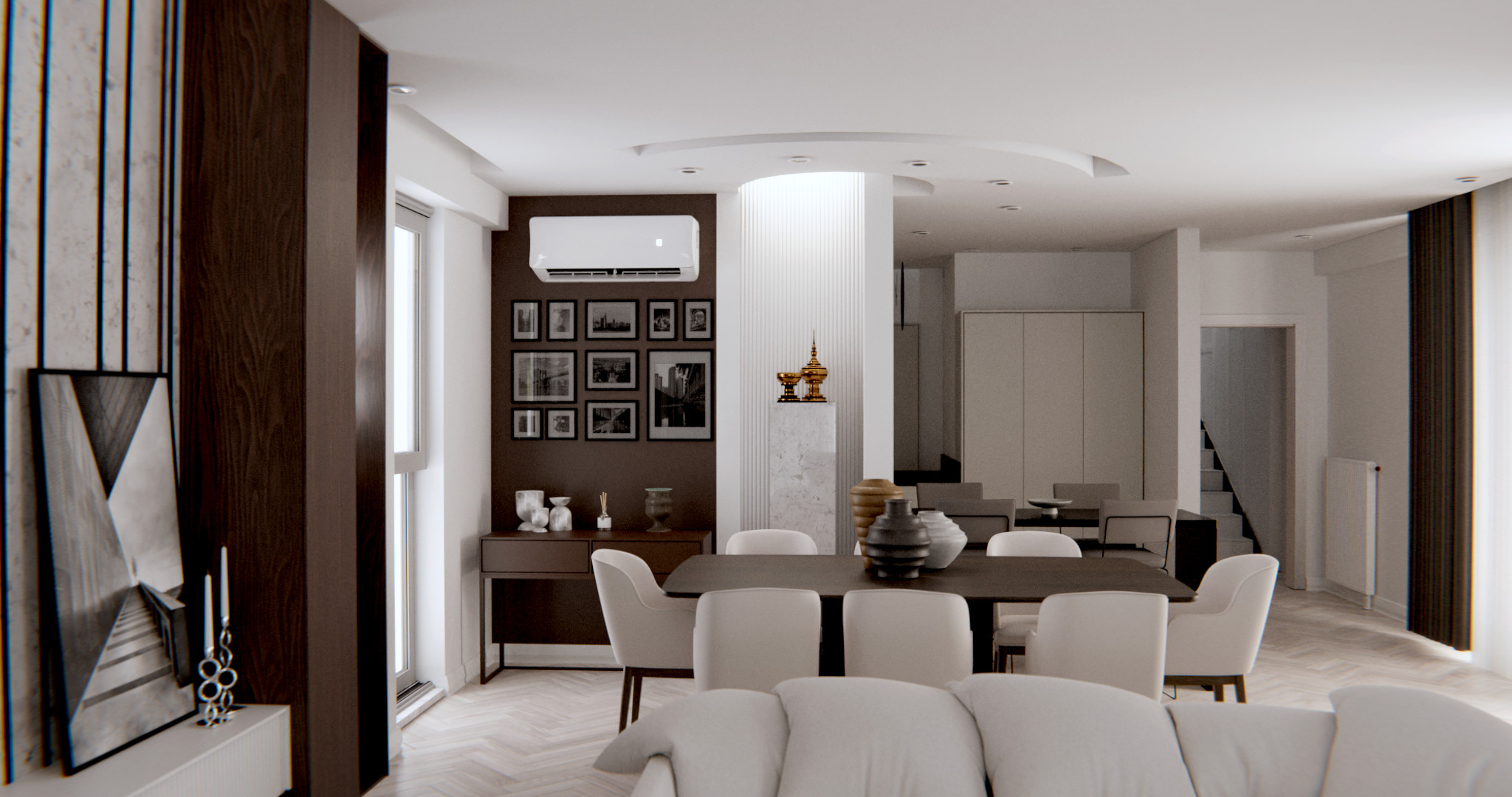 Mevcut dresuvar kullanılarak koyu renk boya ve ahşap paneller ile yemek masasına hitap eden şık bir tasarım yapılması ön görülmüştür.