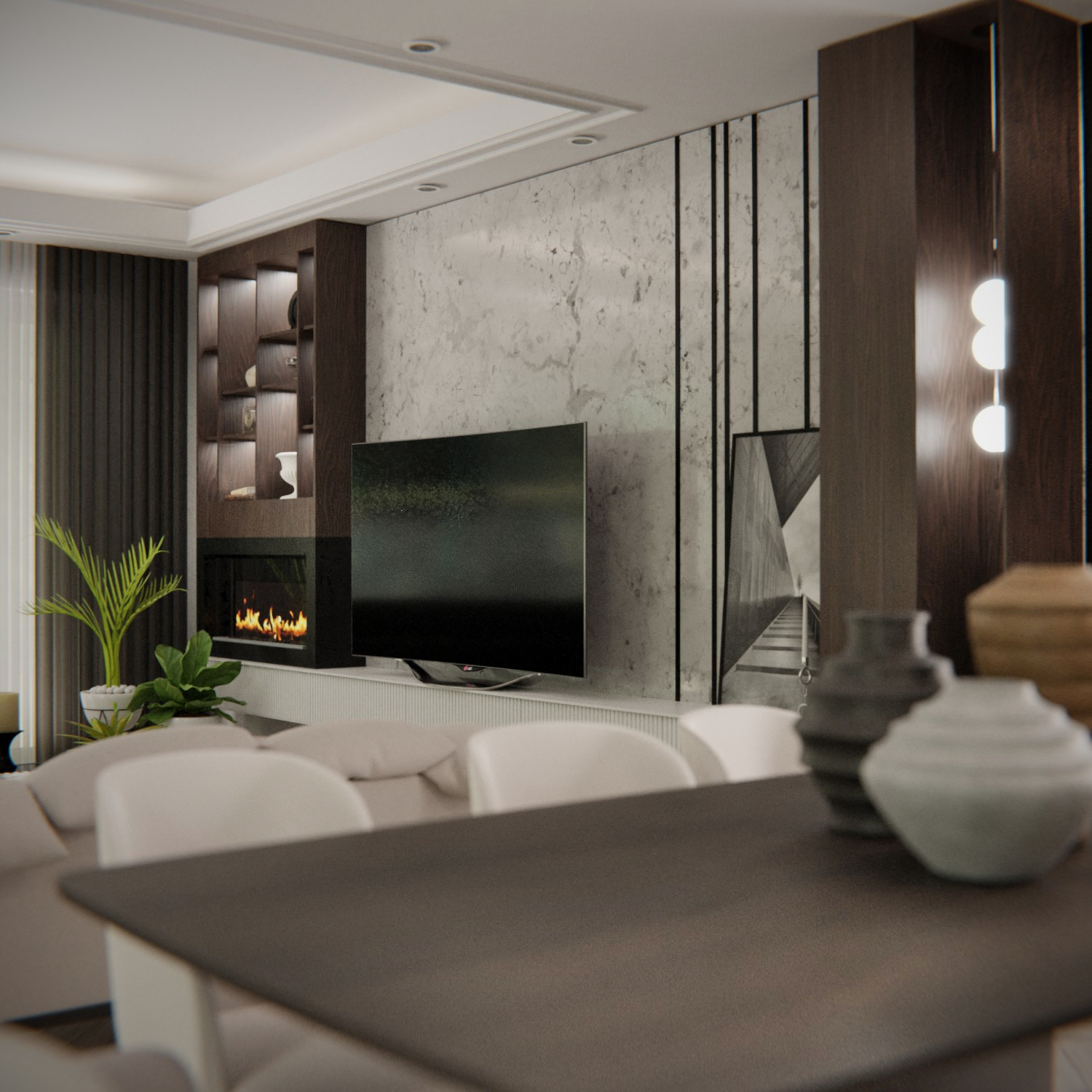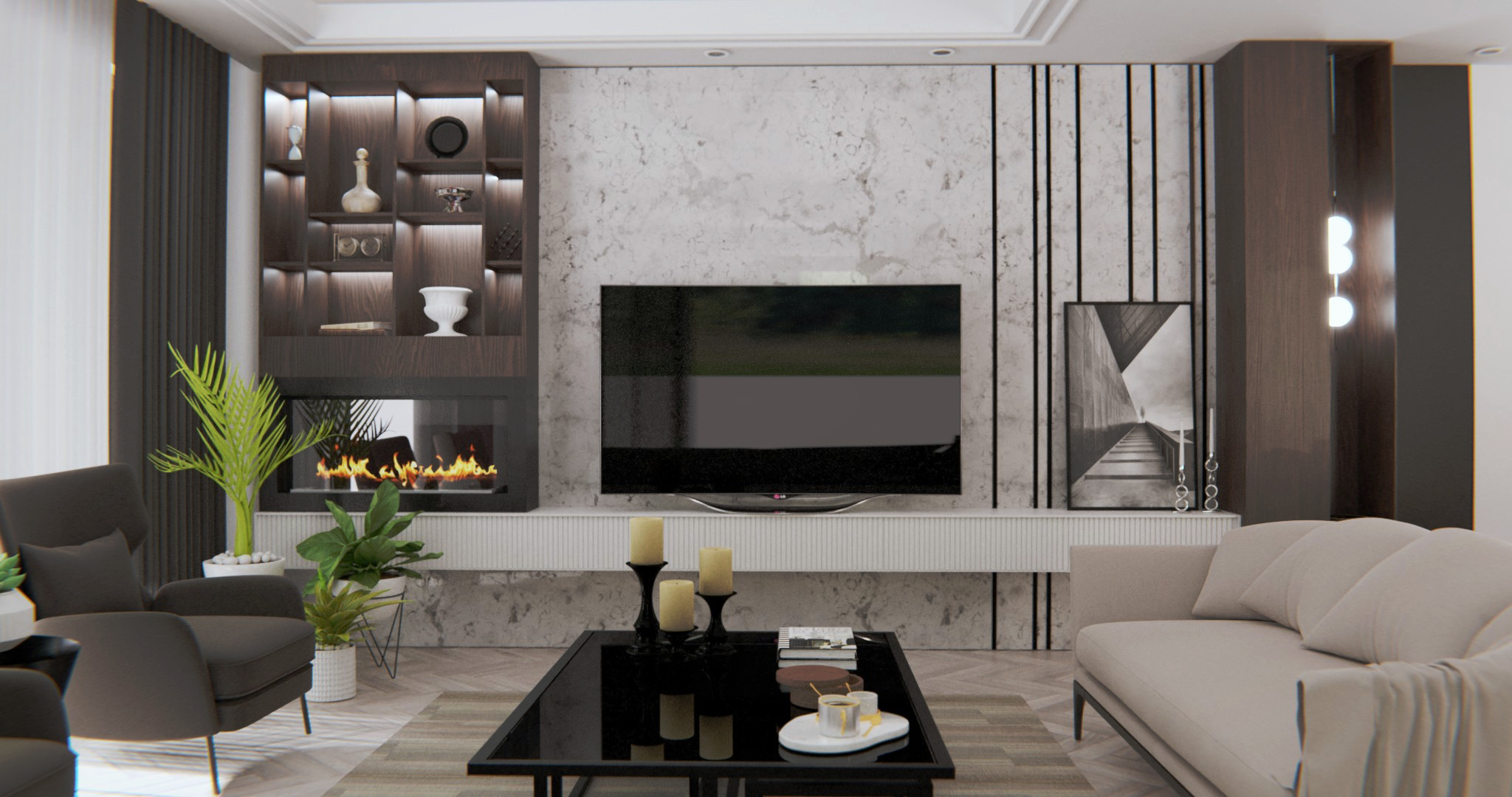 Bursa Bademli 'debulunan evimizin salonunda şıklık ve bütünsel tasarım ön planda tutulmuştur. açık ve kapalı depolama alanları bulunan, elektrik şömineyle desteklenen bir televizyon ünitesi tasarladık.