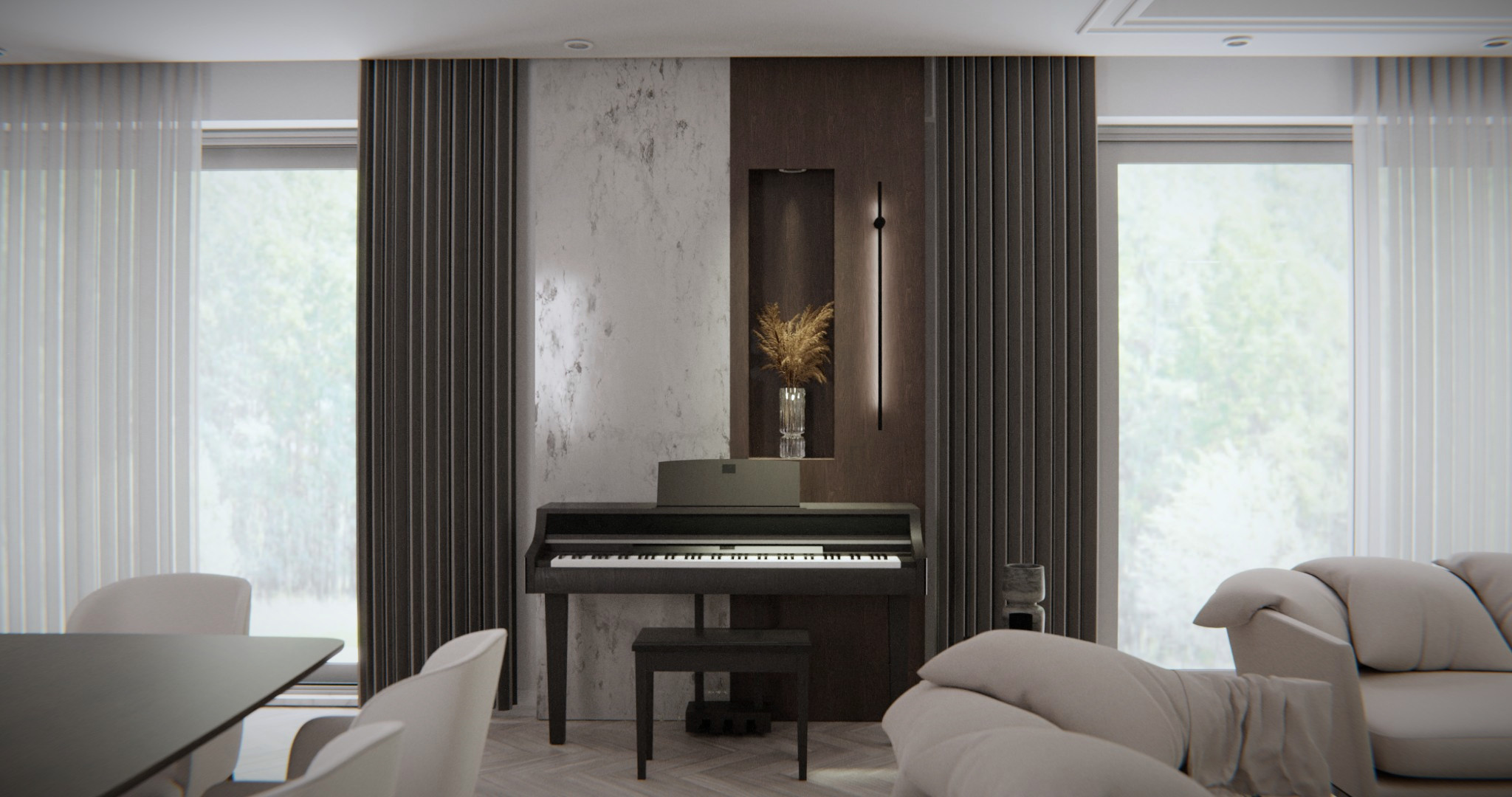 Piyano alanı için de aydınlatma görevi de gören ahşap panel uygulaması yapılmıştır. Mevcut mobilyaları kullanarak zemin perkesinde açık ton parke ile alanın genel havasının değişmesi planlanmıştır.