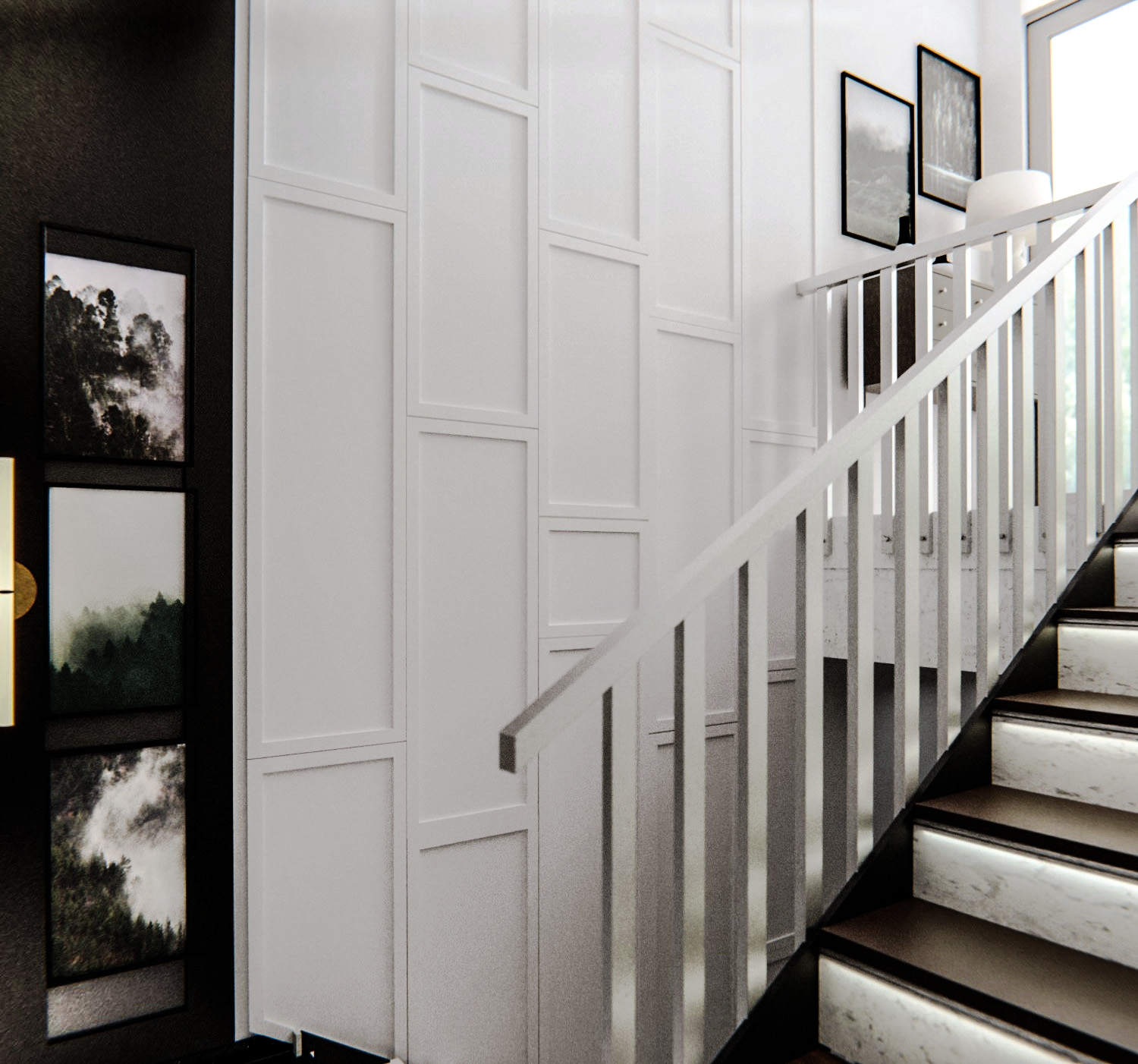 Mevcut dresuarı değerlendirerek, yan duvarlarda ahşap çıtalamalar uyguladık ve giriş kapısının bulunduğu duvarı koyu renkle boyayarak mekâna derinlik kazandırdık. Zemin seramiklerini koruyarak, cam ve rıhtsız merdiveni ışık bantlı, seramik kaplamalı sac merdivenle yeniledik.